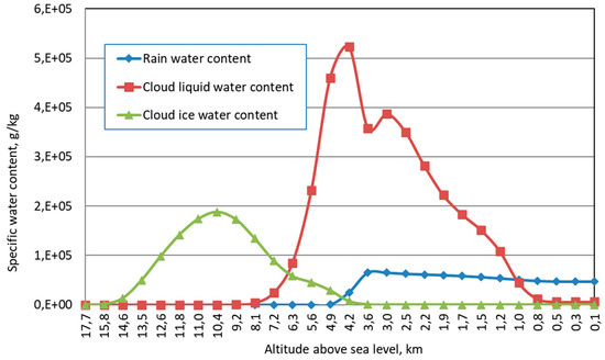 Altitude dependence of specific water content for three cloud substances (rain drops, ice and cloud droplets) is represented in Figure 8. The main water content of the clouds of the study region is located in the liquid-drop phase in the form of cloud droplets. Droplet water content (red curve) is located mainly from 1 to 8 km above sea level and has two maxima in its height distribution. The first mode is located at an altitude of about 3 km, and the second is at 4.5 km. Looking at the rainwater content (blue curve), we can see that it is located in the layer from 0 to 4.9 km, with a maximum at 3.6 km. Apparently, the saddle in the distribution of droplet water content (red curve) between its two maxima is associated with the formation of raindrops by coagulation of large cloud droplets. For this reason, liquid water content here decreases, while rainwater content increases. This generally indicates that the warm mechanism of precipitation formation probably prevails in the region under study. However, these heights are quite close to the 0 C isotherm.