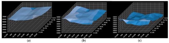 Figure 9 shows the distribution of the integrated water content for three fractions (droplets, ice and rain) on the geographic projection of the region. It can be seen that despite the spatial smallness of the study area, these distributions are uneven over the territory. The ice fraction is especially unevenly distributed (Figure 9b), having a maximum in the northeast of the territory and a minimum in the southwest. But looking at the relief map, one can note some correlation between the topography and the water content of the ice fraction. A slightly inverted distribution in space has a droplet water content (Figure 9a), having a maximum in the west of the region. The rain fraction is most evenly distributed (Figure 9c).