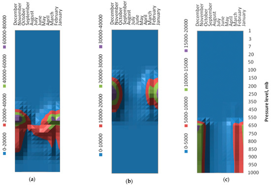 Altitude-monthly distributions of integrated fractions of: (a)—cloud liquid water content; (b)—cloud ice water content and (c)—specific rainwater content over the period of 1979–2019.