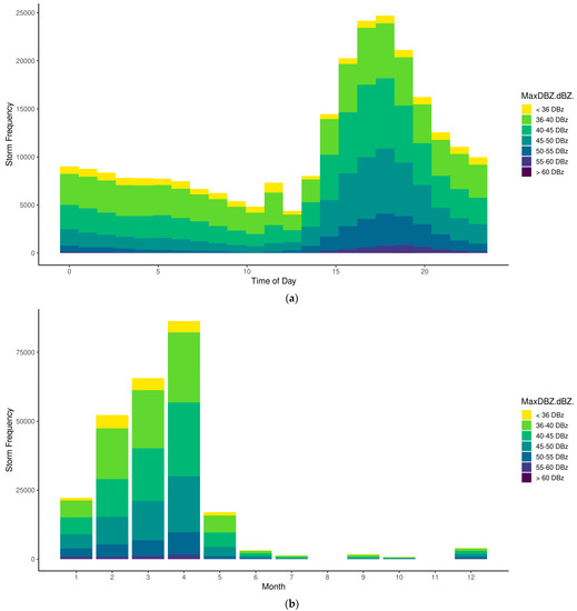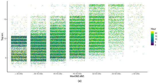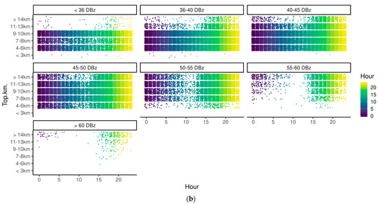 Figure 12a shows distribution of cloud reflectivity, cloud top height and time of occurrence. The horizontal axis shows the distribution of the maximum reflectivity MaxDBZ of clouds in gradations increasing by 5 decibel relative to Z (dBZ) from 30 to 65 dBZ, the vertical axis shows the distribution of clouds along the height of the upper boundary from 0 to 20 km, and additionally the color palette indicates the time of day from 0 to 24 h. This shows that low clouds of stratus and stratocumulus type with a reflectivity of less than 40 dBZ, which usually produce weak precipitation, are observed at night and in the morning. Mid-tier clouds with maximum reflectivity (40–50 dBZ) form on average in the midday and in the afternoon producing the highest precipitation. Once organized, the clouds can form clouds of large vertical extent (more than 5–8 km) with an upper boundary of up to 8–15 km and a reflectivity of up to 50–60 dBZ; these form mostly in the second half of the day and in the late afternoon, typical of afternoon convection