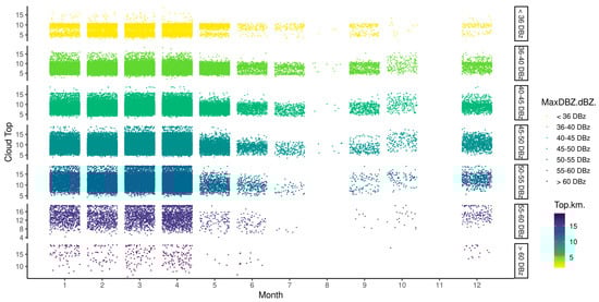 Figure 13 depicts monthly average distributions of cloud top height for different reflectivity levels. It shows that mature cumulonimbus clouds with reflectivity exceeding 60 dBZ can form mainly from December to April and reach heights of 9–15 km. Further, the lower the cloud reflectivity, the less pronounced is the annual seasonality of their formation. Weak low-rain clouds can form at almost any time of the year except August and November.