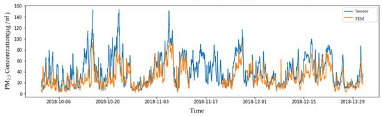 RNNs can process long sequence information; however, their performance decreases as the length of this sequence information increases. This is called the long-term dependency problem. LSTM is a variant of the RNN model used to overcome this problem [,]. The FEM meter and low-cost sensor measurements were corrected based on LSTM (Figure 2) and an artificial neural network that recognized patterns in the time-series data.