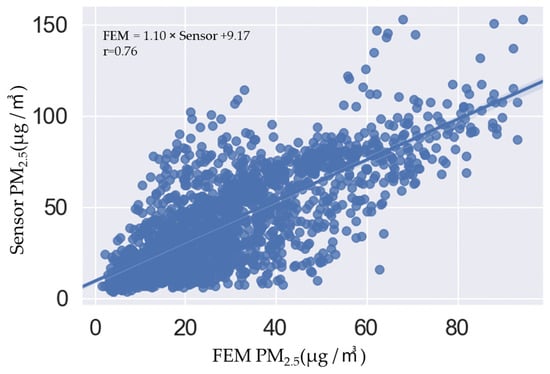 Using the hourly measurement data obtained from the beta-ray absorption method as a reference, a scatter plot was generated by averaging the 1 min data obtained from the light-scattering method. The resulting scatter plot is illustrated in Figure 4. A linear regression analysis of the data yielded a regression formula similar to Equation (10). The correlation coefficient (R) and r2 between the beta-ray absorption and light-scattering methods were 0.76 and 0.57, respectively. The comparison tests between the light-scattering method sensor used in this study and similar sensors tested using the FEM equipment in the field exhibited slightly higher performances, with PMS1003 at R2 = 0.73–0.97 and PMS3003 (r2) (Figure 5) []. Additionally, the comparison analyses between the PM2.5 sensors located at the same position as the FEM equipment had r2 values in the range of 0.33–45 [].