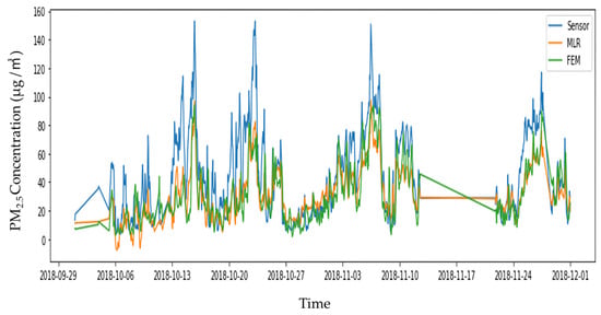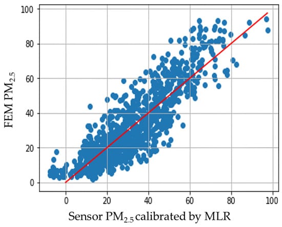 The relationship between the FEM and light-scattering fine dust concentrations was significant, with a modified r2 of 0.75. It was at the Tier II level, as suggested by the US Environmental Protection Agency’s “Air Sensor Guidebook”. The multiple regression analysis correction results based on the correction formula are illustrated in Figure 6.