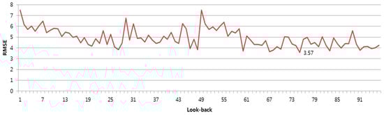 Lookback is a coefficient that determines how much past time interval data should be used for training compared to the reference time of the training data. In this study, the minimum RMSE value over the past 76 h of data collection was determined to be the optimal lookback for calculating the optimal lookback value (Figure 8).