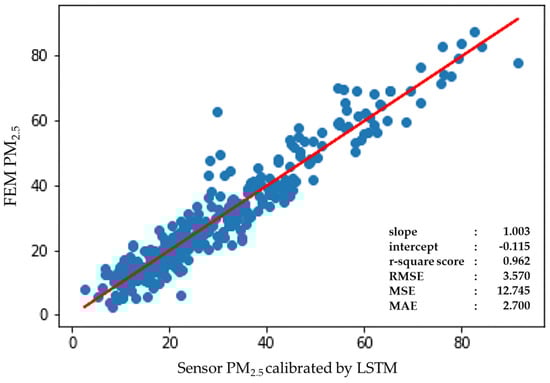 Figure 10 compares the FEM data with the low-cost sensor measurements calibrated using the LSTM model. The r2 was 0.962, which was more accurate than that of the regression analysis (r2 = 0.76).