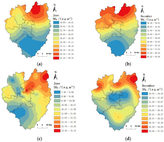 2 in June was mainly in the northeast, west-central, and east-central parts of the city, and the low concentration area was in the northwest and southwest parts of the city; the high concentration area in December was in the northernmost and south-central parts of the city, and the low concentration area was located in the central and southwest fringe areas of the city. The spatial distribution of SO