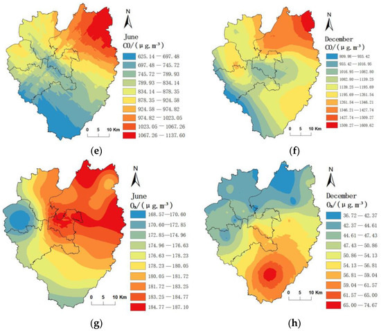 2 concentrations in December than in June. The spatial distribution trends of CO concentrations were similar in June and December, with a stepwise decrease from northeast to southwest and a higher CO concentration in December than in June. The low O