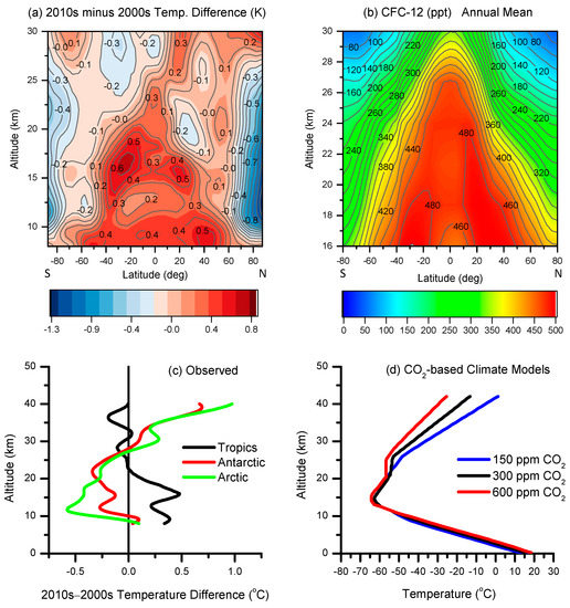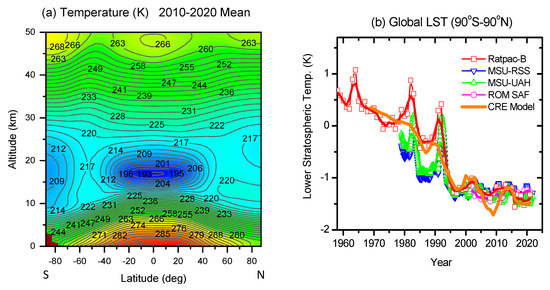38]. First, it was robustly demonstrated that the variations in both ozone and lower-stratospheric temperature (LST) are dominantly governed by both (halogen-containing) ozone-depleting substances (ODSs) and CR intensity only [