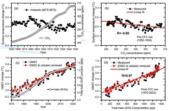 2 on the stratospheric climate. Second, the author made the first prediction in 2008–2009 that the long-term change in GMST since 1950 was mainly caused by halo-GHGs (mainly CFCs). This prediction was first based on the found correlation between observed GMST and total concentration of atmospheric CFCs [