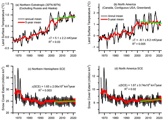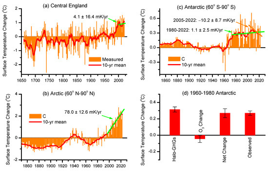 14] showed strong evidence that the post-2015 warming is mainly caused by Arctic amplification of surface warming due to sea-ice loss, without which a global reversal in warming would have occurred since ~2005. This conclusion is drawn from comprehensive observed datasets and statistical analyses of troposphere–stratosphere temperature (T) climatology, global lower-stratospheric T (GLST), global surface air T, sea-ice extent (SIE) and snow-cover extent (SCE), combined with analytical, parameter-free calculations of GMSTs by a quantum physical model of climate change caused by halogen-containing greenhouse gases (GHGs) (hereafter halo-GHGs) [