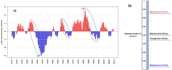 (a) Water level anomalies in Lake Titicaca. The regions in blue represent negative anomalies, while the regions in red represent positive anomalies. The regions in black lines represent periods of extreme drought. (b) Reference levels represented on the limnimetric scale.