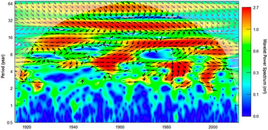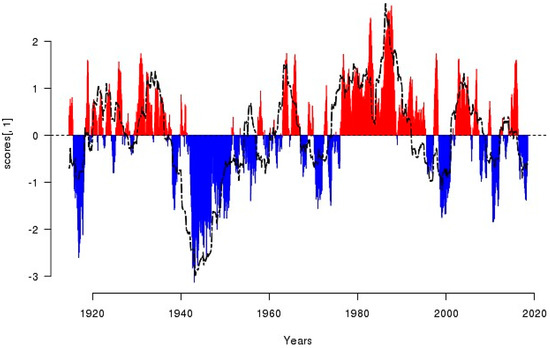 The correlation coefficients between EOF1 for the WL data and the IPO for the period from September 1914 to July 2018 were as follows: CP1 (0.55) and CP2 (0.45). The first component explains 55% of the total variance, and the coefficients of the eigenvector primer, 0.7071068 and 0.7071068 (CP1), are equal and both positive, indicating a strong positive correlation. This suggests that the first principal component, PC1, is a weighted average of both variables, capturing the common variability between the WLs and IPO. Figure 3 illustrates the time series of PC1 and the WLs from September 1914 to July 2018. Positive (negative) values of PC1 correspond to the warm (cold) phase of the IPO and the increase (decrease) in the WLs. The warm phase of the IPO from 1979 to 1999 was characterized by extreme El Niño events and some weak La Niña events, which could be associated with the presence or absence of precipitation in the region. Similar findings were reported by [31,36,58]. In Figure 3, a phase shift between the IPO values and the WLs is observed. According to [41], this would be determined by the balance between water inputs and losses.