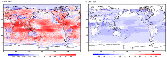 Comparison of the 24 h forecasts of latent heat fluxes (W/m2) averaged in July 2016. The left panel (a) is the difference between the original GRAPES_GFS experiment (CTL) and ERA interim reanalysis, and the right panel (b) is the difference between the improved GRAPES_GFS experiment (EXP1; with modifications in the parameterizations of surface latent heat fluxes) and the CTL experiment. The 24 h forecasts started from each day during 1–31 July 2016.
