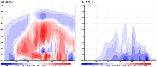The correction of surface latent heat fluxes also improves the forecasts of atmospheric water vapor content at different pressure levels (Figure 2). As compared with ERA-Interim reanalysis, there are positive biases in the GRAPES_GFS CTL experiment for the atmospheric water vapor forecasts from surface to 400–600 hPa between 60 S–60 N (Figure 2a). The positive biases are more significant in the subtropical Northern Hemisphere than in the subtropical Southern Hemisphere (Figure 2a), which is consistent with the results for the positive biases of latent heat fluxes. With modified parameterizations of soil evaporation and ocean surface roughness length, the GRAPES_GFS EXP1 experiment reduced the positive biases of low-level atmospheric water vapor content significantly, especially from surface to 850 hPa between 30 S–60 N (Figure 2b). Again, the improvement in the forecasts of atmospheric water vapor content is more significant in Northern Hemisphere.