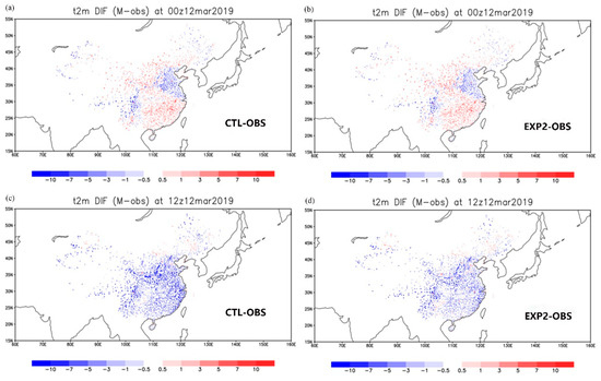 Biases for the 2 m air temperature forecasts (°C) at 2000+ weather stations in China. The forecasts started from 12 UTC on 11 March 2019, with the lead times of 12 h (top panels, a,b) and 24 h (bottom panels, c,d). The left panels (a,c) are for the biases of CTL experiment, and the right panels (b,d) are for the biases of improved GRAPES_GFS experiment (EXP2; with modifications in the parameterizations of soil evaporation and roughness length).