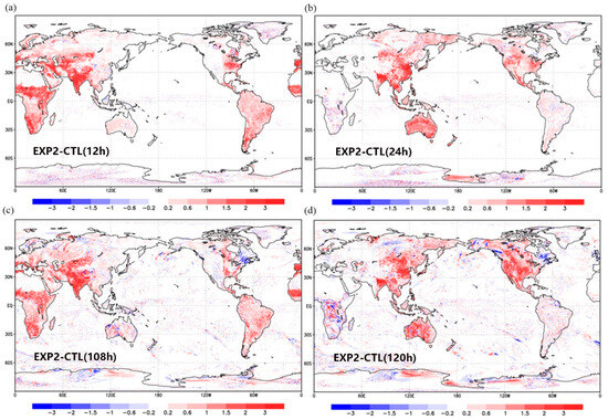 Considering that the 2 m air temperature is the most critical information provided by routine weather forecasts, we also assessed the GRAPES_GFS performance in this regard. Figure 3 shows a snapshot of the 2 m air temperature forecast over China on 11 March 2019. As compared with the 2 m air temperature observations at national weather stations, the GRAPES_GFS forecasts have warm biases at 00 UTC over most stations except for Huang-Huai-Hai plain and Sichuan province (Figure 3a) and large cold biases at 12 UTC across China (Figure 3c). Since the 2 m air temperature is determined by the gradient of land skin temperature and bottom atmospheric temperature, we carefully analyzed each component affecting the 2 m air temperature calculation and found that the nighttime 2 m air temperature is much lower than the bottom atmospheric temperature and land skin temperature, which suggests that GRAPES_GFS underestimated the canopy temperature at night. In addition, we noted that GRAPES_GFS did not take into account the difference between the heat/moisture roughness length and the momentum roughness length, which are actually very different [35]. Therefore, in this paper, we adopted the thermal roughness length calculation method of ECMWF IFS to correct the unreasonably low value of nighttime canopy temperature and finally reduced the cold biases of nighttime 2 m air temperature in eastern China (Figure 3d), although the biases for daytime 2 m air temperature did not change (Figure 3b). We extend the analysis from China to the globe and from the forecasts within the first 24 h to 120 h. Figure 4 shows that the new parameterizations effectively increased the local nighttime temperature around the globe, and the increases are consistent over forecast lead times.