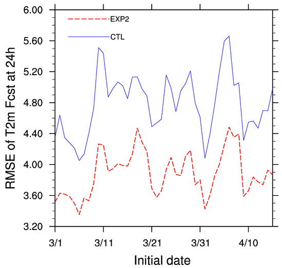 Root mean squared error (RMSE; °C) of 24 h forecasts of 2 m air temperature for CTL experiment and improved GRAPES_GFS experiment (EXP2; with modifications in the parameterizations of soil evaporation and roughness length). The forecasts started at 12 UTC on each day from 1 March 2019 to 15 April 2019. The forecasts were compared with the observations from 2000+ weather stations in China, and the mean RMSEs were shown.