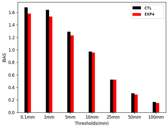 Biases of 24 h precipitation forecasts (mm) started each day from 16 June 2019 to 30 September 2019 for CTL experiment and improved GRAPES_GFS experiment (EXP4; the model version is the same as EXP3, but for forecasts during summer period). The bias was calculated as the ratio of forecast rainfall events over the observed rainfall events, and the values close to 1 suggested un-biased forecasts. The horizontal axis showed the rainfall thresholds, where the events with daily rainfall larger than the threshold were counted. The forecasts were compared with the observations from 2000+ weather stations in China, and the mean biases were shown.