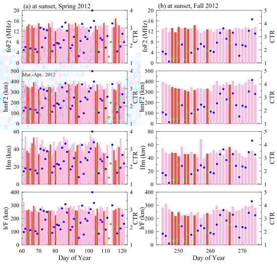 Day-to-day variations in foF2, hmF2, Hm and h’F at sunset on both scintillation and non–scintillation days during spring (a) and fall (b) equinox in 2012. EIA CTRs derived from GRACE observations are also marked in the figure. The pink and red bars represent the parameters, and the blue dots and green dots represent the CTR on scintillation and non-scintillation days, respectively.