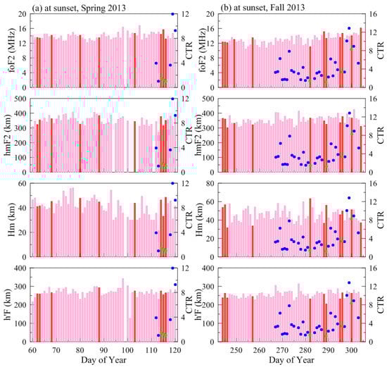 Figure 1 and Figure 2 display the day-to-day variations in foF2, hmF2, Hm and h’F at sunset on both scintillation and non-scintillation days during the spring (a) and fall (b) equinoxes in 2012 and 2013, respectively. EIA CTR derived from GRACE observations are also marked as blue dots on scintillation days and green dots on non-scintillation days in the figures. The pink bars and red bars represent the parameters on scintillation days and non-scintillation days, respectively. The average sunset time at Sanya was 1125 Universal Time (UT) (LT = UT + 7.5) during the spring equinox and 1100 UT during the fall equinox during 2012–2013.