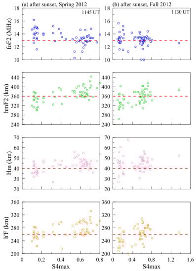 Furthermore, Figure 3 and Figure 4 show the variations in foF2, hmF2, Hm and h’F at the time 30 min after local sunset with the daily maximum S4 (S4max) index on both scintillation and non-scintillation days during the spring (a) and fall (b) equinox in 2012 and 2013, respectively.