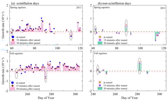The day-to-day variations in growth rates from ionosonde measurements at sunset (blue, orange dots), 15 min after sunset (red, magenta rectangles) and 30 min after sunset (pink, green bars) on scintillation (a) and non−scintillation (b) days during equinoctial months in 2012. The red dashed lines represent that the growth rates were equal to zero. The dashed-line circles represent the abnormal days.