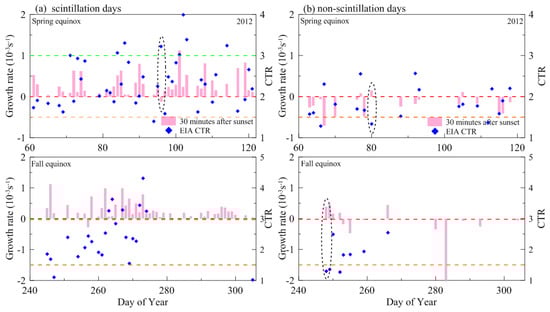 The day−to−day variations in growth rates from ionosonde measurements at the time about 30 min after sunset onboth (a) scintillation and (b) non−scintillation days, during equinoctial months in 2012. EIA CTRs from GRACE observations are also marked as blue rectangles in the figure. The red dashed lines represent that the growth rates were equal to zero, and the green and orange dashed lines represent a CTR equal to 3 and 1.5, respectively. The dashed-line circles represent the abnormal days.