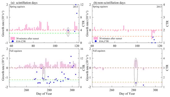 As shown in Figure 7 and Figure 8, compared to the results shown in Figure 3 and Figure 4, we can notice that EIA CTR was larger than 3 on few scintillation days, but the growth rates were negative, while CTR was small (smaller than 1.5) on the non-scintillation days, but the growth rates were positive. For instance, on two scintillation days (DOY96 in 2012 and DOY275 in 2013, circled by the dashed lines in the figures), the growth rates were negative and the CTRs were larger than 3 (CTR = 3.2 on DOY96 and CTR = 3.34 on DOY275). On DOY248 and DOY252 in 2012 and DOY282 in 2013, non-scintillation days, the growth rates were positive and the CTRs were smaller than 2 (CTRs were 1.3 on DOY248, 1.2 on DOY252 and 1.4 on DOY282). These values imply that scintillation may occur as EIA is strong enough, though the growth rate is negative. On the contrary, scintillation may not occur as EIA is very weak, though the growth rate is positive. Therefore, to predict the occurrence of irregularities and scintillation in equatorial and low-latitude regions, the variations in EIA strength can be considered together with the growth rate of R–T instability.