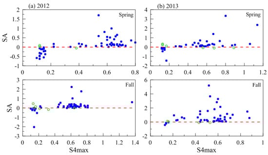 Furthermore, Figure 9 presents the variations in the index SA with S4max during the spring and fall equinoxes in 2012 (a) and 2013 (b). The blue dots represent true prediction and the green circles represent false prediction. It should be noted that there were no GRACE observations on some days, especially in 2013; we suppose that the SA is equal to the simplified growth rate (γ).
