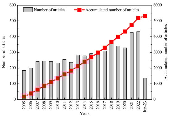 This study made use of data sourced from the WoS core collection database. The search was carried out on 5 June 2023. The examination of the available literature indicated that the earliest publication focused on satellite ozone was released in 1961. Further analysis showed that the number of relevant publications was very small from 1961 to 2004, and it was not until 2005 that the annual publication count exceeded 200. In the field of bibliometrics, it is generally considered that results obtained from analyzing a literature collection with an average annual publication count exceeding 200 and a time range of over 10 years have typical representativeness []. Therefore, the time range for the literature collection used in this study was set from 1 January 2005 to 5 June 2023. By employing the search query “TS = (satellite ozone)”, we successfully discovered a comprehensive collection of 5365 publications. The output format of the search results is set as “Full Record and Cited References” and “Plain Text”. Upon excluding conference papers, notes, and publications in languages other than English, we obtained a dataset of 5320 publications with original research papers and review articles.
