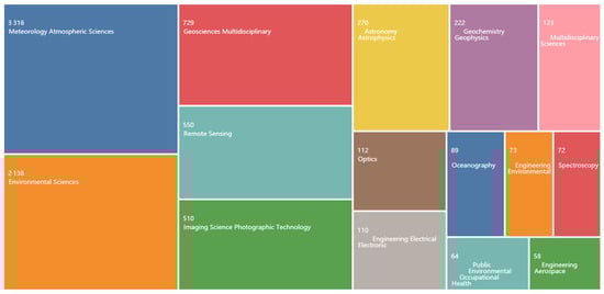 Figure 3 displays the WoS categories of 5320 publications in this study. The statistical results indicate that research papers in the field of satellite ozone cover a wide range of WoS categories. Among them, the top three WoS categories are “Meteorology Atmospheric Sciences”, “Environmental Sciences”, and “Geosciences Multidisciplinary”, with 3318, 2138, and 729 articles, respectively, accounting for proportions of 61.845%, 39.851%, and 13.588% of the total number of articles.