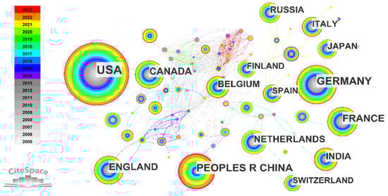 In Figure 4, the network of collaborative partnerships among countries is illustrated, encompassing 125 nodes and 937 links during the period from 2005 to 2023. The color coding of the nodes corresponds to the publication timeline, while the connecting lines between the nodes depict the collaborative relationships between the respective countries. Additionally, Table 1 provides an overview of the top 10 countries in terms of both publication volume and betweenness centralities. The betweenness centrality of a node in a network quantifies the likelihood of that node being part of the shortest path between any two nodes. Nodes with high betweenness centrality often serve as bridges connecting distinct communities or sub-networks, which is why they are referred to as “betweenness” centrality []. Based on Figure 4 and Table 1, it can be observed that the USA has the highest publication count with 2564, far ahead of other countries. Germany, China, and France closely follow with publication counts reaching 1037, 869, and 629, respectively. It is worth noting that although the USA has the highest publication count, its betweenness centrality is only 0.01. Meanwhile, France has the highest betweenness centrality at 0.26, yet it ranks fourth in terms of publication count. This indicates that there is no clear positive correlation between publication count and betweenness centrality. Researchers conducting the literature analysis should take note of this issue. On the whole, developed countries demonstrate a higher level of research excellence in the field of satellite ozone compared to developing countries, evidenced by their superior performance in publication count and betweenness centrality. In addition, Figure 4 indicates that international collaborative research on satellite ozone among two or even multiple countries is currently the mainstream trend.