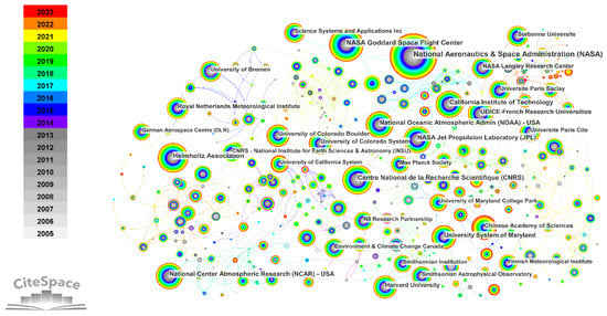 The visual representation in Figure 5 demonstrates the establishment of academic partnerships among a network of 556 nodes and 941 links. The nodes in the network correspond to the volume of publications, while the interconnecting links signify the cooperative relationships established among the institutions. Table 2 provides a compilation of the top 10 institutions that have made remarkable contributions in terms of research publications. Noteworthy examples include the National Aeronautics and Space Administration (NASA) with 1264 publications, the NASA Goddard Space Flight Center with 704 publications, the Helmholtz Association with 546 publications, the Centre National de la Recherche Scientifique with 533 publications, the California Institute of Technology with 458 publications, the National Oceanic Atmospheric Administration with 455 publications, the NASA Jet Propulsion Laboratory with 453 publications, the National Center Atmospheric Research with 446 publications, the UDICE-French Research Universities with 403 publications, and the University System of Maryland with 380 publications. Among the top 10 academic institutions, apart from 1 institution from Germany and 2 institutions from France, the rest are all from the United States. This phenomenon indicates that American institutions have shown extremely active involvement in the field of satellite ozone research. It is worth noting that the top 10 institutions in terms of publication count had already started collaborative research on satellite ozone as early as 2005, which coincided with the time when the concept of satellite ozone was first introduced. Furthermore, Figure 5 also indicates that the vast majority of institutions have cooperative relationships, which suggests that academic collaboration plays a crucial role in the development of the satellite ozone research field.