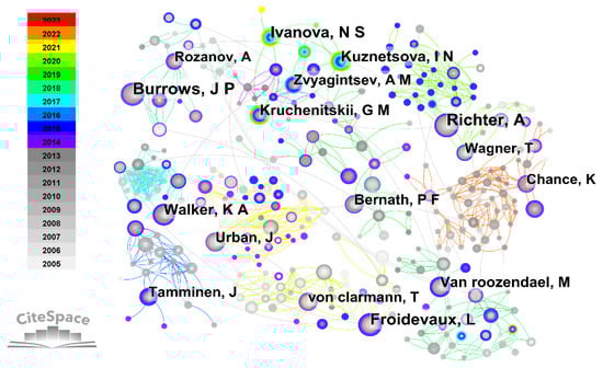 The visual representation depicted in Figure 6 showcases the intricate network of author collaborations, comprising 948 individual nodes and 3016 interconnected links spanning from 2005 to 2023. The advancement of the research community can be discerned based on a specific network characterized by a highly organized framework. Table 3 displays the ranking of the top 10 authors who have made significant publication contributions. Richter A., a distinguished researcher hailing from the Institute of Environmental Physics at the University of Bremen, stands out as the top contributor in the study of satellite ozone, with an exceptional publication record of 62 articles. Meanwhile, Richter A. holds the highest centrality score (0.06) and has the earliest publication date (2005) among all authors in this field. Therefore, researchers interested in understanding the origins and development of the satellite ozone field are advised to refer to the publications authored by Richter A. and their team. It is worth mentioning that Joanna Joiner, a scholar from NASA Goddard Space Flight Center, has accumulated 39 publications on satellite ozone since her first paper in 2015. As a result, her ranking in publications has rapidly climbed to ninth place. Researchers interested in the latest research hotspots and development trends in satellite ozone are advised to pay special attention to the publications by Joanna Joiner and her team.