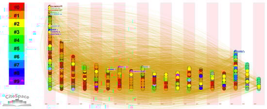 CiteSpace is a software tool commonly used for bibliometric analysis and visualization of the development of research domains, as well as the connections among authors, institutions, and keywords []. Its primary function is to examine large quantities of bibliographic data sourced from academic databases, like WoS, Scopus, and Google Scholar. CiteSpace empowers users to generate diverse visual representations encompassing highly cited papers, author networks, and clusters of keywords. These visualizations provide valuable insights into the progression of research fields over time, pinpoint significant scholarly contributions and influential authors, and identify emerging trends and potential avenues for future investigation [].