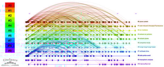 In this study, the construction of the reference co-citation network involves employing a log-likelihood ratio (LLR) weighting algorithm to assess the articles and their cited references within the dataset. The LLR algorithm aids in assigning specific professional terminology to accurately identify and categorize the clusters []. According to the visual representation in Figure 7, the co-citation network comprises 1449 nodes and 5031 links. This network is segmented into 20 distinct co-citation clusters, and the specific characteristics of each cluster can be found in Table 4. It should be noted that all clusters achieved a remarkable silhouette score, suggesting a strong level of consistency within the co-citation network. The labels assigned to the clusters in Table 4 represent well-established and enduring research subjects within the domain of satellite ozone. Consequently, in order to elucidate the knowledge structure of this domain, a thorough examination and analysis of the clusters must be conducted. In this study, the top three clusters based on their size are selected for detailed analysis.