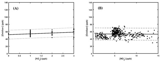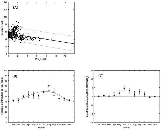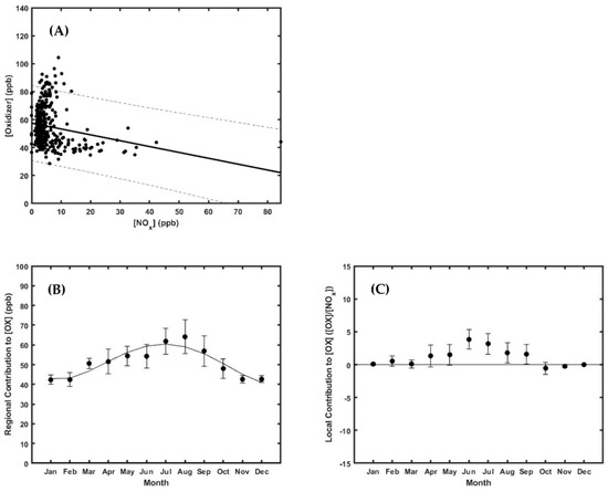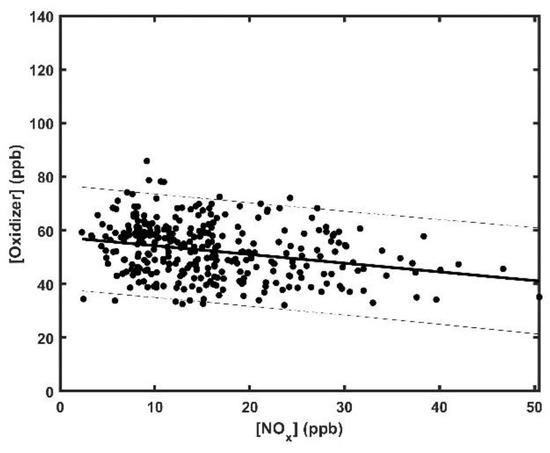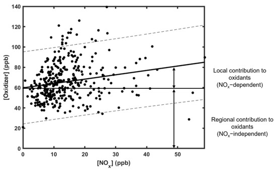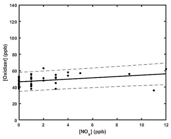 Clapp et al. described the relationship between ambient levels of O3, NO2, and NO and a method for determining the local and regional contributions to oxidizers, which is defined in their work as the sum of O3 and NO2 [23]. The relationship between O3, NO2, and NO is described as a steady-state interconversion of NO to NO2 and NO2 to NO, as follows [24]:
