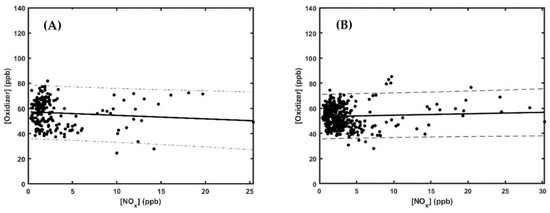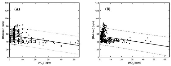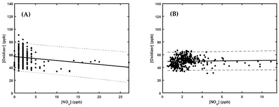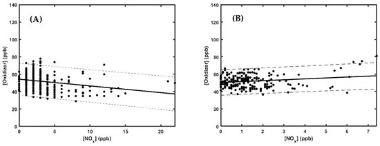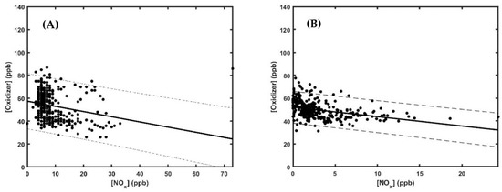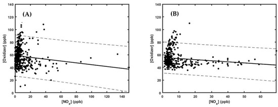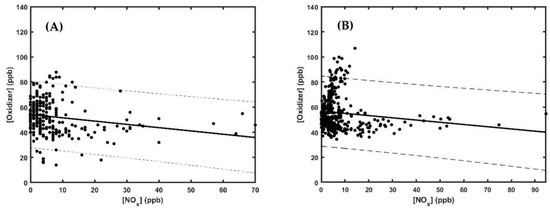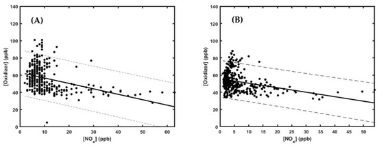 Weber County with 95% confidence interval to the fit shown by the dashed lines. (A)—2012 [OX] = −0.49 [NOx] + 57; (B)—2022 [OX] = −0.44 [NOx] + 55. The solid line represents the fit line for the linear regression and the dashed lines represent the 95% confidence interval in the fit.