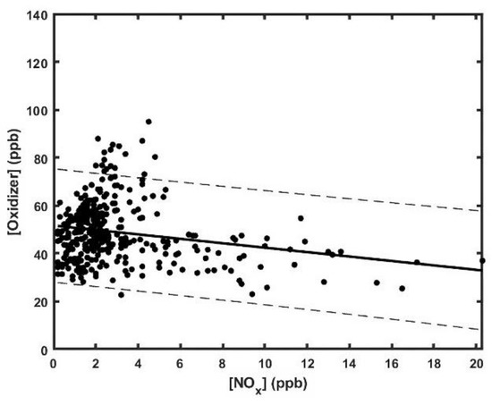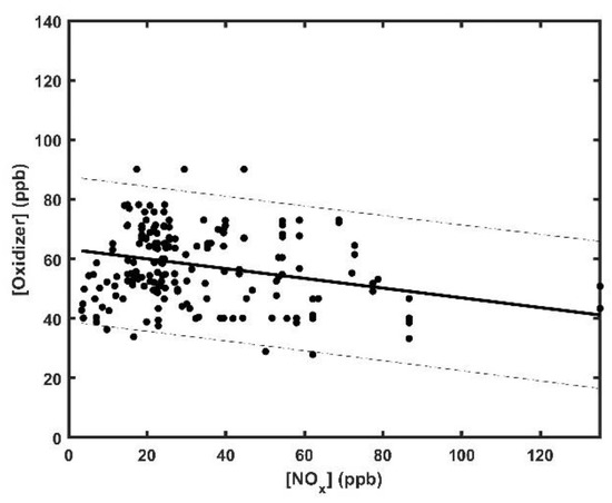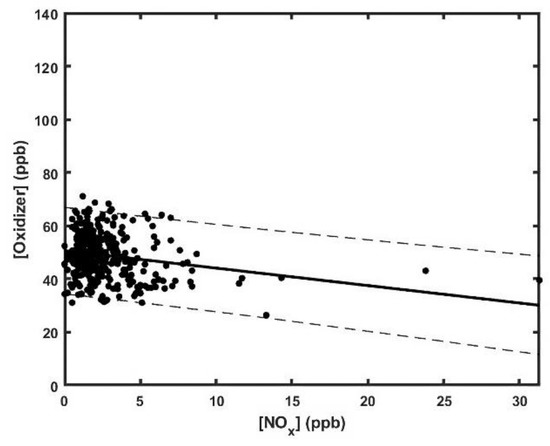 Fundamental to more elaborate atmospheric models, such as the Master Chemical Mechanism (MCM), Community Multiscale Air Quality Modeling System (CMAQ), and Comprehensive Air Quality Model with extensions (CAMx), is the mechanism described by reactions 1 and 2 for the formation of O3 [25,26,27]. The relationship described above becomes non-linear when nitric acid is formed, removing NOx from the mechanism described by reactions 1 and 2; however, for the current analysis, a linear relationship is assumed between oxidants and NOx [28]. This photostationary relationship is often referred to as the Leighton Relationship [24,29]. The linear relationship between oxidants and NOx in this cycle has been shown by Clapp et al. [23].