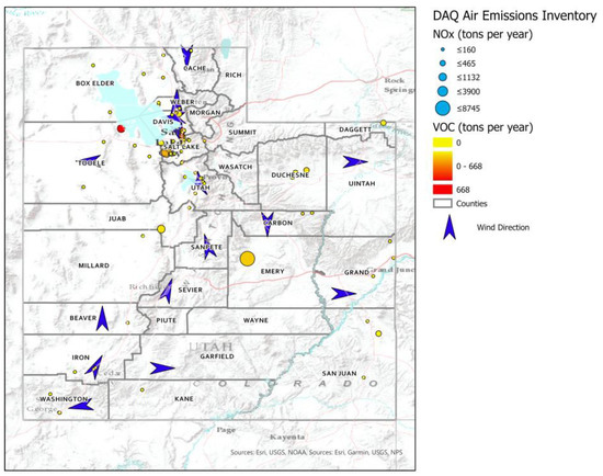 Utah, USA map of counties, UDAQ permitted point source emitters [36], and prevailing wind direction [34].