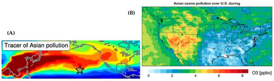 (A) shows typical transport of pollution from Asia to the United States. The star indicates where Hawaii is situated. (B) shows Asian ozone pollution distributed over the US. Images used with permission from UDAQ [42,43].