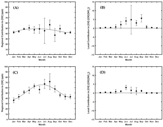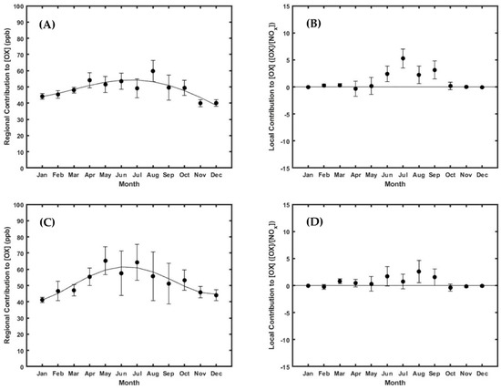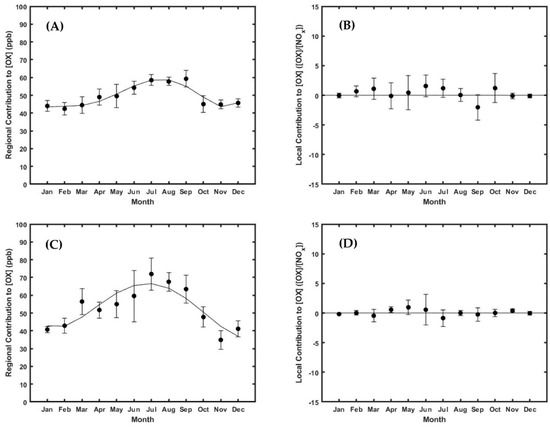 Cache County monthly analysis with 95% confidence interval to the fit. (A)—Regional contribution to the oxidant concentration, 2022; (B)—Local contribution to the oxidant concentration, 2022; (C)—Regional contribution to the oxidant concentration, 2012; (D)—Local contribution to the oxidant concentration, 2012.