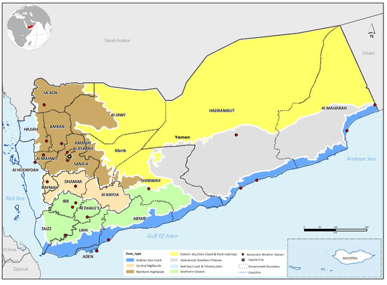 Agroecological zones of the study area, Yemen. The insert shows the location of Yemen on the global map, as depicted by the red shading.