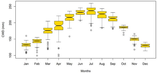 Monthly cycle of climatic water deficit (CWD; mm) across Yemen, averaged over longitude 42.6° to longitude 53.2° and latitudes 12.7° to 17.6°, for the period 1958–2021. This box and whisker plot shows the five-number summary of CWD across Yemen. The bottom-most horizontal line of each plot is the minimum, followed by the first quartile, then the vertical line that goes through the box is the median, followed by the third quartile, and the maximum.