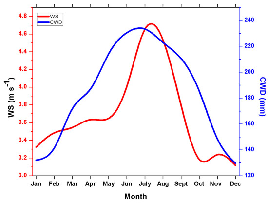 In the first set of analyses, we examined the long-term monthly cycle of water deficits across the country. We found mean monthly water deficits ranging between 97 and 260 mm (Figure 2). We further observed that while the country is characterized by water deficits that are generally over 100 mm throughout the year, intensification begins soon after the winter season, around March/April, suggesting that the warming up of temperatures triggers an intensification of water deficits. In a nutshell, while climate change impacts the global hydrological cycle in complex ways [40], evidence suggests that warmer temperatures are associated with higher evaporative rates, which lead to intensified water deficits, especially in arid environments [41,42]. With a statistically significant correlation coefficient of 0.8 at α = 0.005, further evidence shows that the intensification of water deficits is associated with a rise in wind speed across the country (Figure 3). This finding points to the effect of wind speed on evapotranspiration and, thus, CWD [31].