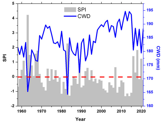 Interannual variations of the standardized precipitation index (SPI) and climatic water deficit (CWD) across Yemen (R = −0.7), averaged over longitude 42.6° to longitude 53.2° and latitudes 12.7° to 17.6° for the period 1958–2021. The red dotted line denotes the separation between the wet and dry years on the SPI scale.