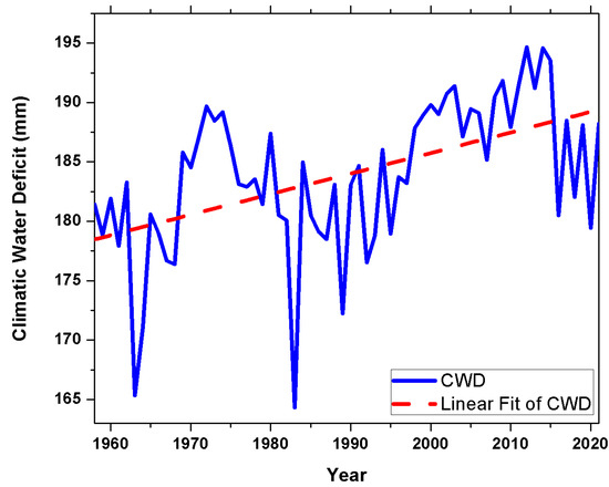 The trend of climatic water deficit (CWD) across Yemen (Sen’s slope 0.17; p-value = 0.006; α = 0.005), averaged over longitude 42.6° to longitude 53.2° and latitudes 12.7° to 17.6° for the period 1958–2021.