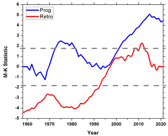 After assessing the trends in the different hydrological fluxes using the m-MK trend test, we employed the sequential Mann–Kendall (MK) test, as proposed in the work of [37] to detect abrupt changes in the fluxes. The sequential Mann–Kendall test considers the progressive row of Kendall’s normalized tau ( coefficient), which is also referred to as the forward statistic u(t), and the retrograde row of Kendall’s normalized tau, i.e., the backward statistic u’(t). The Boolean vector is then used to indicate at which indices of the original time series the progressive and retrograde cross, which is considered TRUE at the point of abrupt changes [38]. To compute the sequential Mann–Kendall test, we used the Pheno package [39] in the R programming language [36].