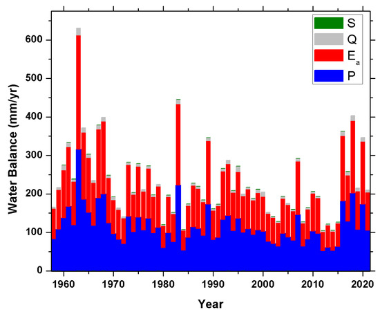 Interannual water balance fluctuations (mm/yr) across Yemen, averaged over longitude 42.6° to longitude 53.2° and latitudes 12.7° to 17.6°, for the period 1958–2021. S is the change in water storage, Q is runoff, Ea is evapotranspiration, and P is precipitation.